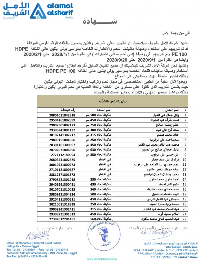 Al-Amal Al-Sharif Plastic Factory, which considered one of the largest and oldest polyethylene pipe factories in the Middle East, has supervised the training and the accreditation of scientific material quality and practical efficiency.